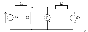 图示电路中,V是电压表。当1A电流源单独作用时,V的读数为3V;而当5V电压源单独作用时,V的读数为2V。若将5V电压源换成15V的电压源,并与1A的电流源共同作用,则V的读数为( )。